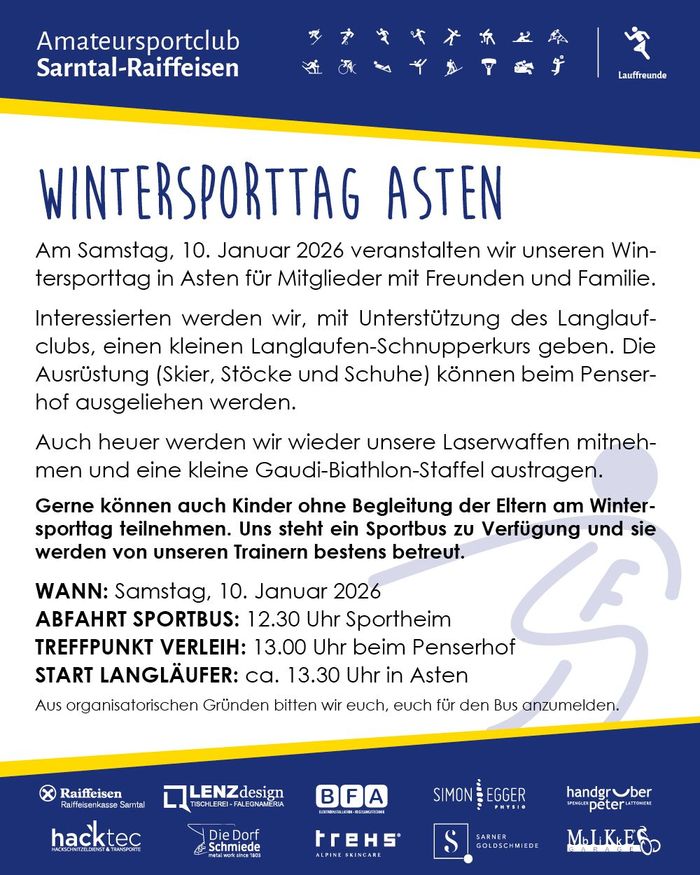 Der Pauschalbetrag beinhaltet Mitgliedsbeitrag, Ganzjahrestraining (ca. 66 Stunden): im Winter von November bis März 1 x wöchentlich in der Halle und im Sommer von April bis Oktober 2 x wöchentlich im Freien, verschiedene Aktivitäten im Sommer, Begleitung und Teilnahme an VSS-Rennen, Jugendbergläufen und Crossläufen inkl. Fahrt, Nenngeld und FIDAL-Tesserierung. Mitglieder können kostenlos an allen Vereinsrennen teilnehmen und sind mit Familie zur Abschlussfeier eingeladen.